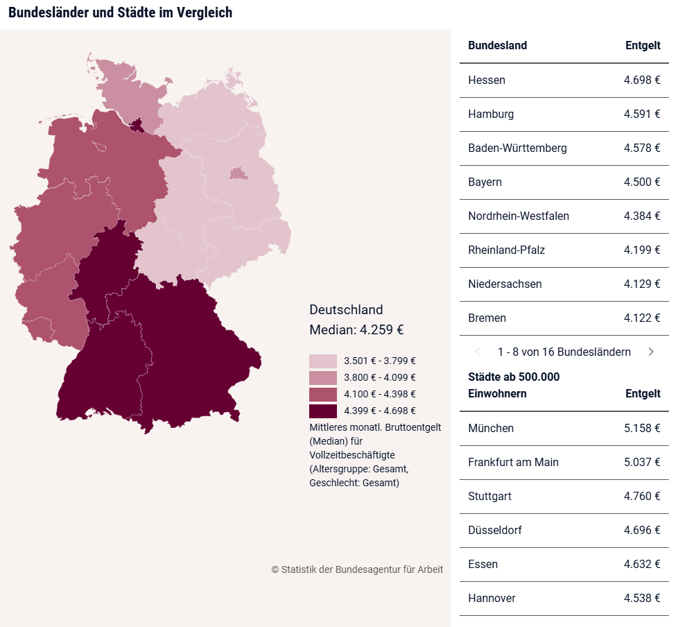 Зарплата указана в €, без вычета налогов. Основано на данных Gehalt и Bundesagentur für Arbeit.